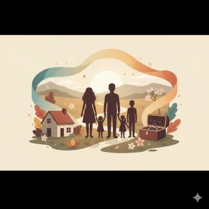 桜と紅葉が舞う和風の窓辺で、2人の子供と数匹の犬に囲まれ、向かい合って座る若い夫婦のシルエット。温かい家族の風景。